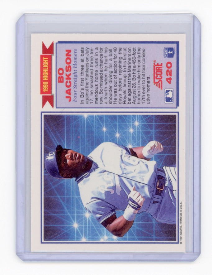 The 1991 Score #420 Bo Jackson Highlight Score Card captures a defining moment in the career of one of baseball's most dynamic athletes. Known for his rare combination of power and speed, this collectible card showcases Bo Jackson’s exceptional talent during the prime of his career. A valuable addition for serious collectors, it reflects both the historical significance and the athletic prowess that made Jackson a legend. Perfect for expert collectors aiming to deepen their baseball memorabilia collection with a piece that stands out for its significance and condition.