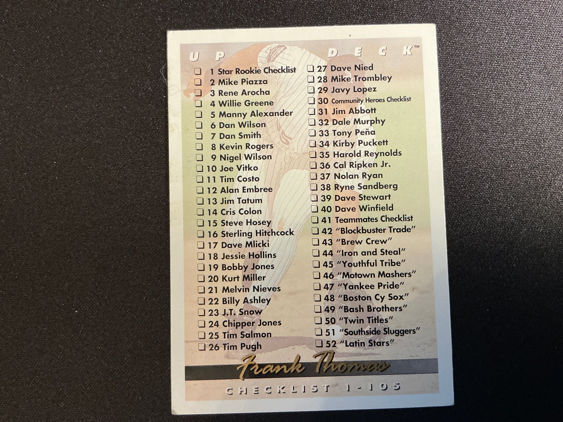 La tarjeta de lista de verificación de Frank Thomas de Upper Deck n.° 105 de 1993 es una pieza clave para los coleccionistas que se centran en la leyenda de los White Sox. Esta tarjeta complementa la icónica colección de novatos de Frank Thomas, ayudando a los entusiastas a seguir y completar sus colecciones de Upper Deck de 1993 con precisión. Su diseño auténtico y la marca oficial de Upper Deck la convierten en una valiosa adquisición para los aficionados a las tarjetas de béisbol.