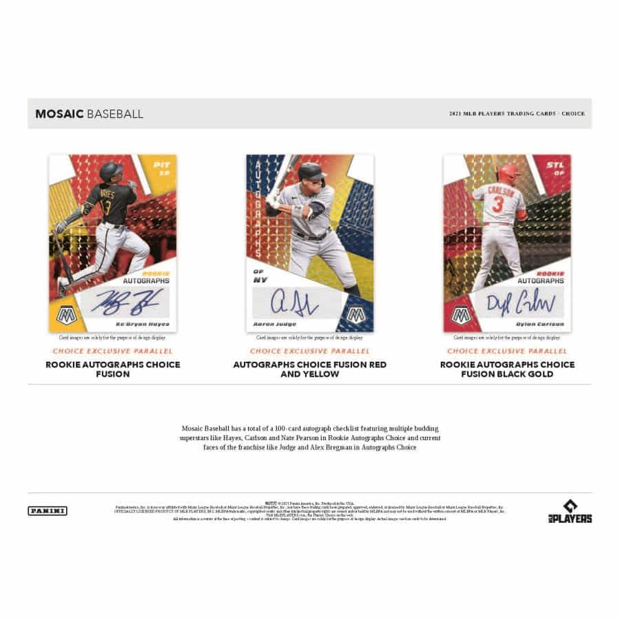 - Mosaic Baseball has a total of a 100-card autograph checklist, featuring multiple budding superstars like Ke’Bryan Hayes and Dylan Carlson in Rookie Autographs Mosaic and current faces of the franchise like Aaron Judge and Alex Bregman in Autographs Mosaic!
