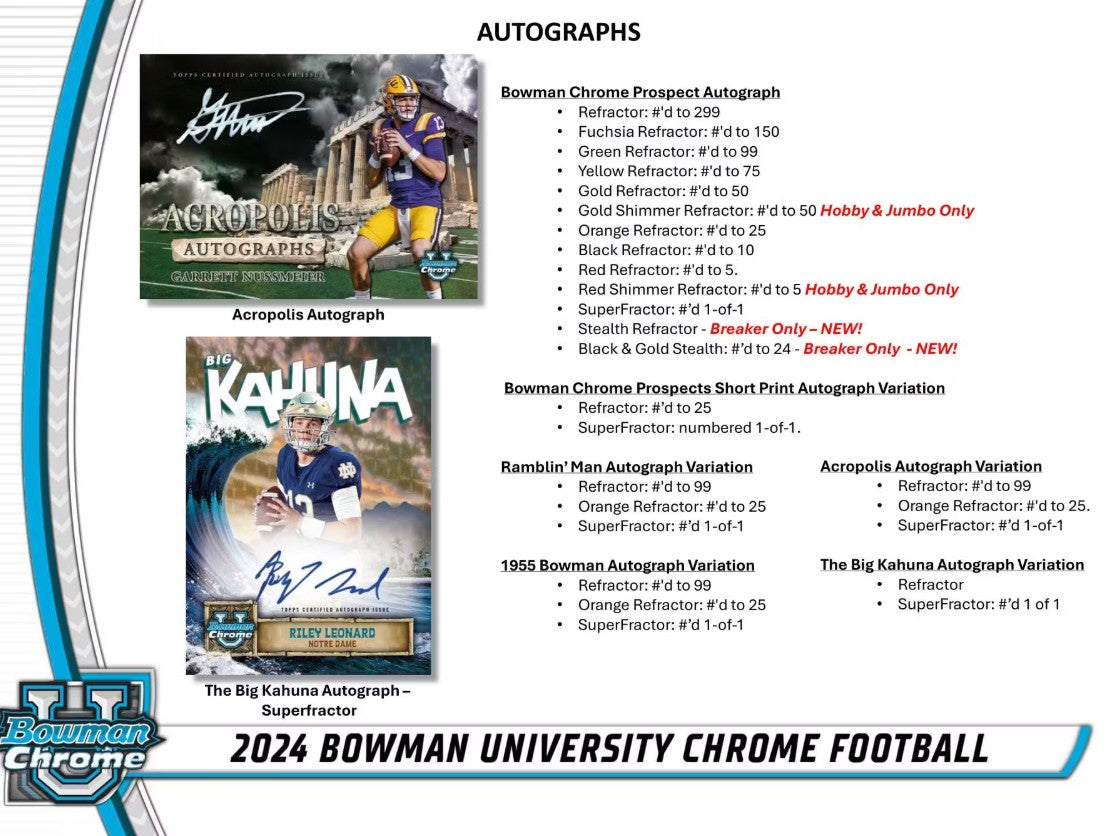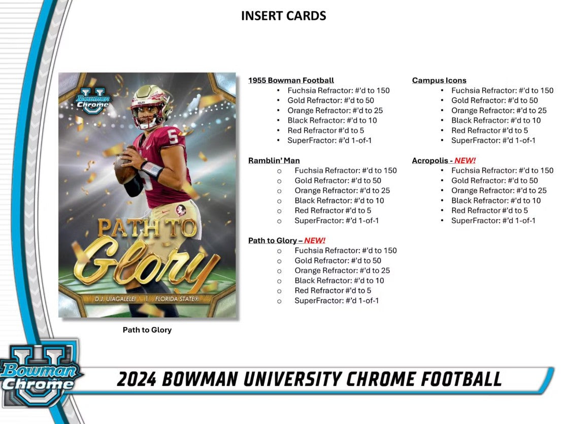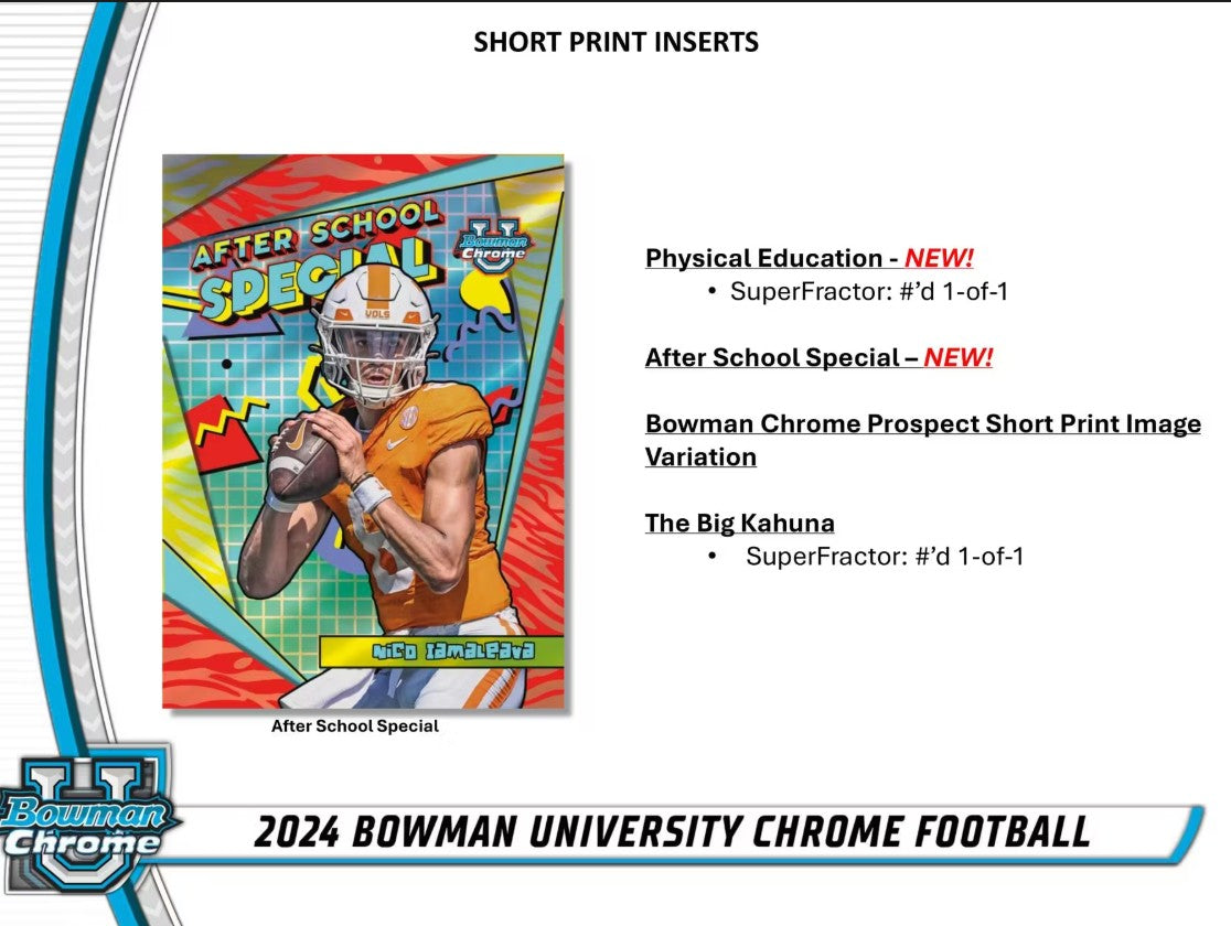 Get ready to storm the field, Bowman University Chrome Football is back for the 2024 College Football season! Look for the top prospects across the nation, with their very first Bowman Cards!