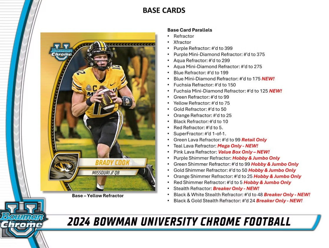 Get ready to storm the field, Bowman University Chrome Football is back for the 2024 College Football season! Look for the top prospects across the nation, with their very first Bowman Cards!