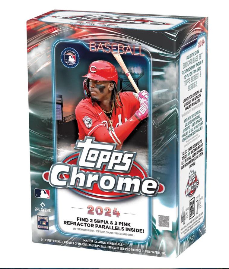 Topps presents the 2024 MLB Chrome Baseball Trading Card Value Box! Each box contains 7 packs with 4 cards per pack. Find 2 Sepia & 2 Pink Refractor Parallels Inside! Keep an eye out for Retail Chrome Rookie Autographs, Green Refractor Parallels as well as many other Vibrant Chrome Color Parallels!