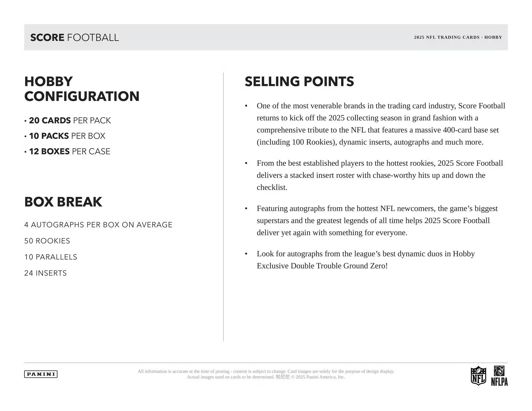 One of the most venerable brands in the trading card industry, Score Football returns to kick off the 2025 collecting season in grand fashion with a comprehensive tribute to the NFL that features a massive 400-card base set (including 100 Rookies), dynamic inserts, autographs and much more.